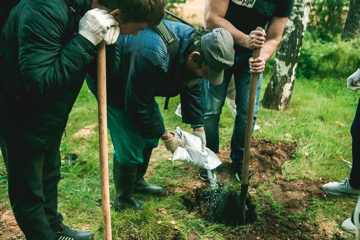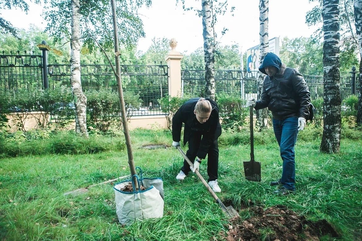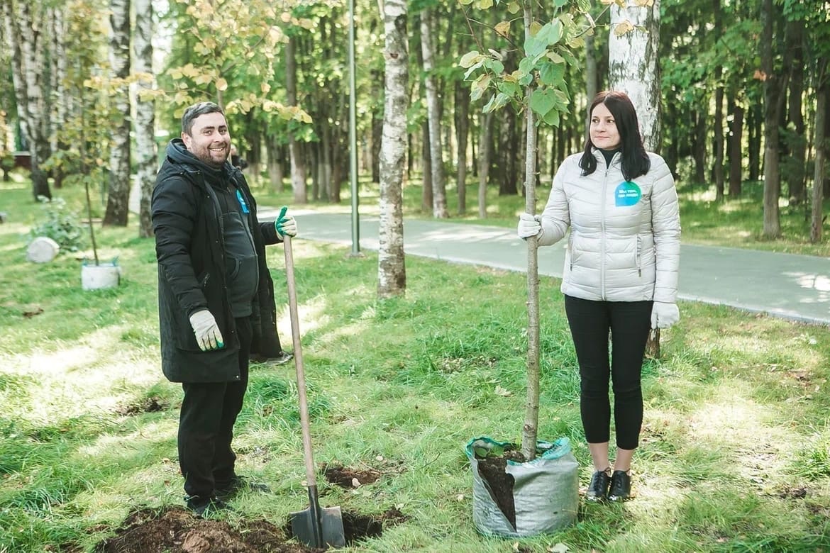 15 деревьев в ряд высадили сегодня сотрудники Росреестра и Кадастровой палаты по Нижегородской области в парке «Швейцария».