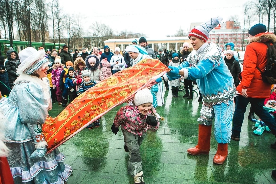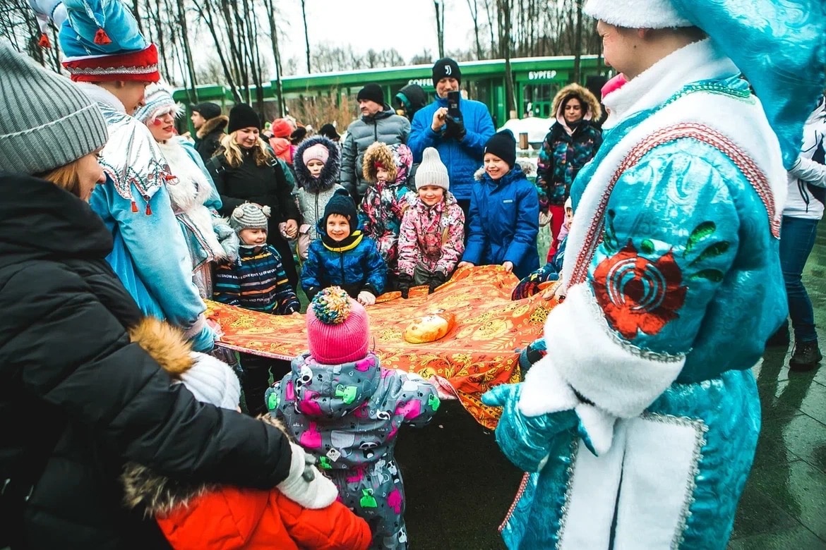 Скороморохи, купец с купчихой и сама Масленица развлекали детей разнообразными конкурсами и забавами: прыганье на лошадках, хоровод вокруг ленточной карусели, ручеек и ладушки.