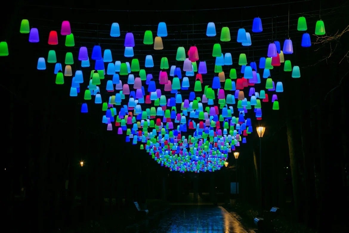 Главная-Новости-Чудо-аллея появилась сегодня в парке «Швейцария»! Тысяча фонариков освещают дорогу от большого фонтана до качели-беседки.