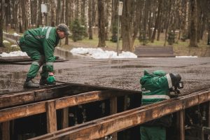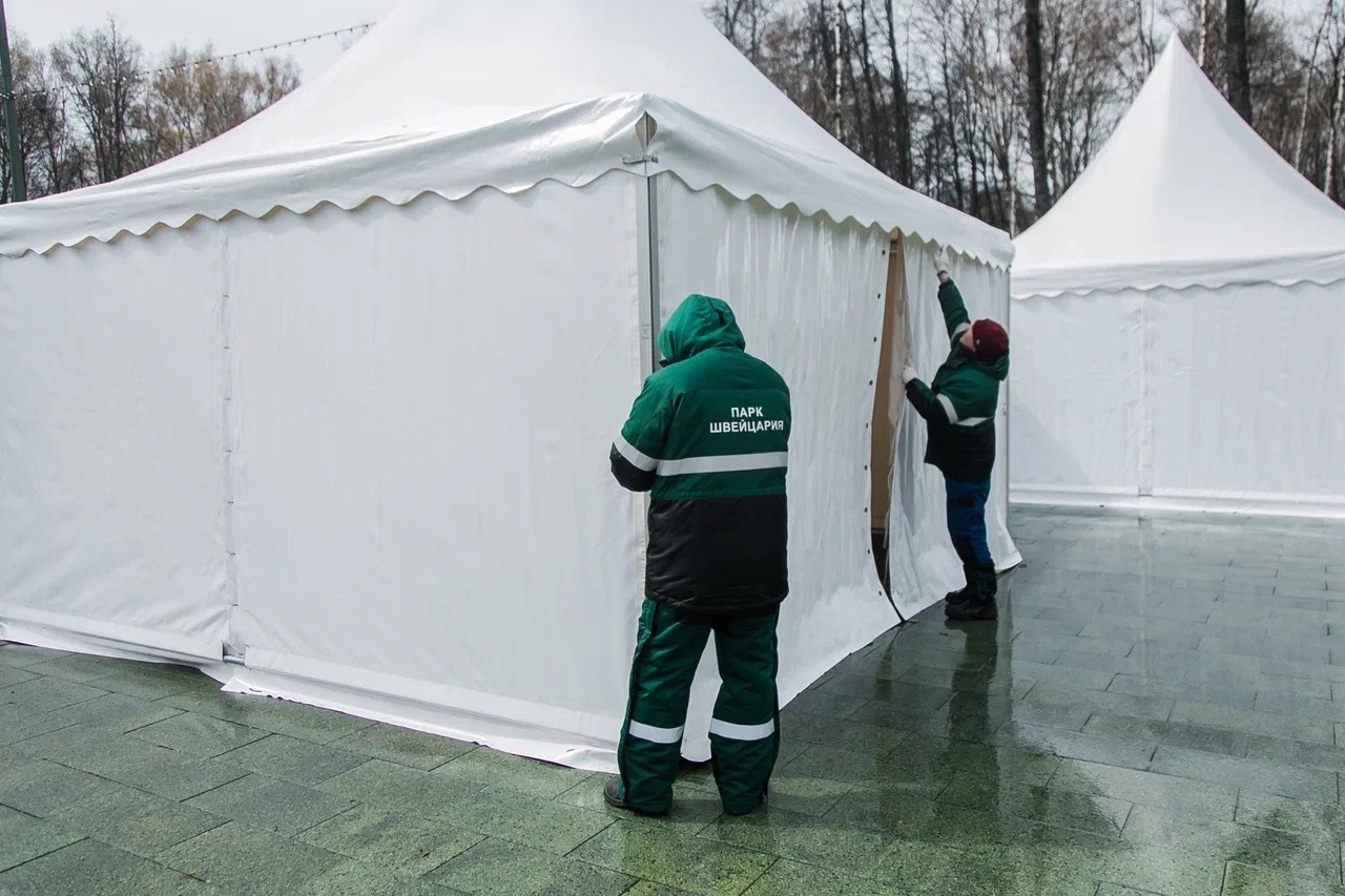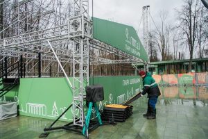 Дождь, снег, ветер, серость… А в парке — жизнь! Наши сотрудники в строю всегда: метут, красят, чинят — без остановки, без передышки. А еще — с особой заботой монтируют сцену: она готовится встречать гостей на празднике 1 мая!