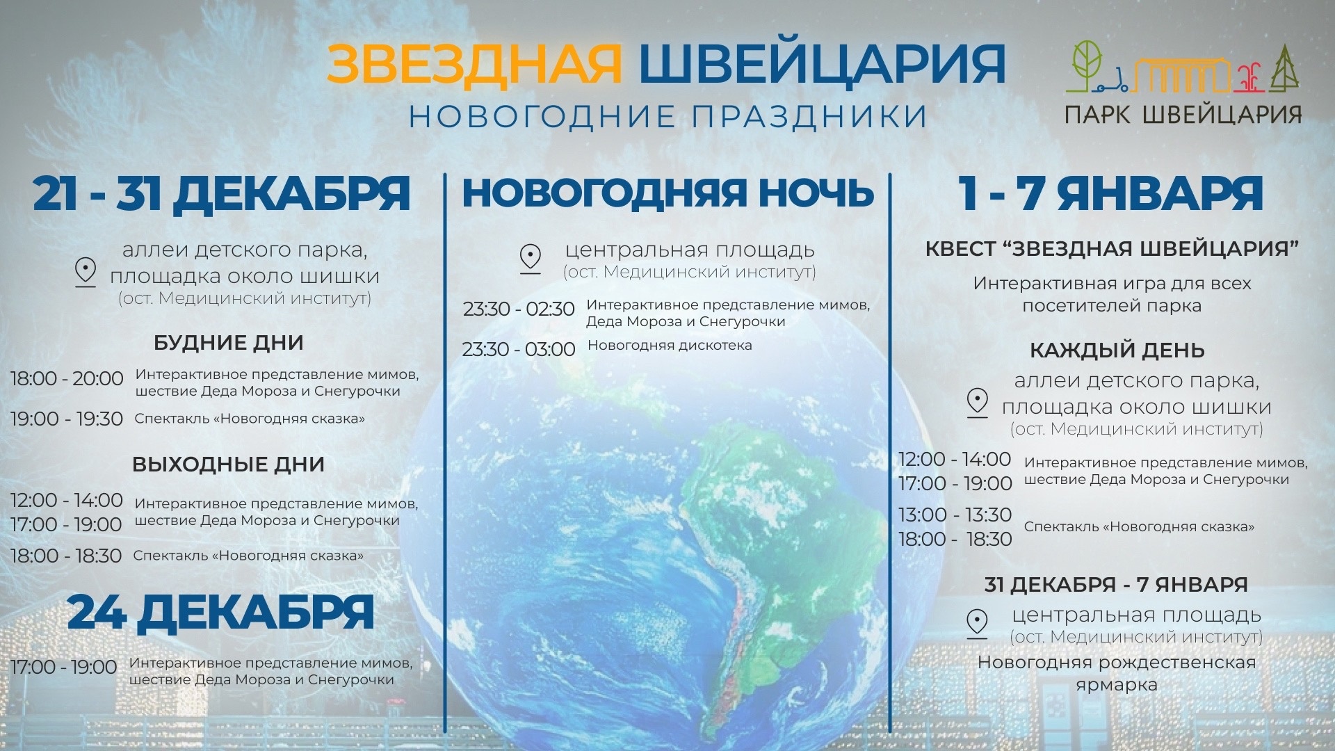 Предлагаем сохранить наглядное расписание новогодних праздников в парке «Швейцария» и простой совет: .