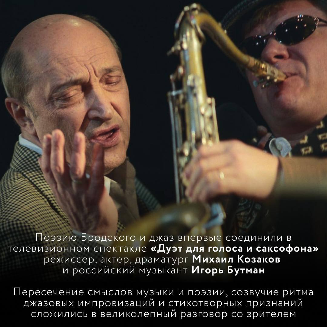 Поэзию Бродского и звуки джаза впервые подружили Михаил Козаков и Игорь Бутман в телевизионном спектакле «Дуэт для голоса и саксофона». Созвучие ритма джазовых импровизаций и стихотворных признаний сложились в откровенный разговор со зрителем.
