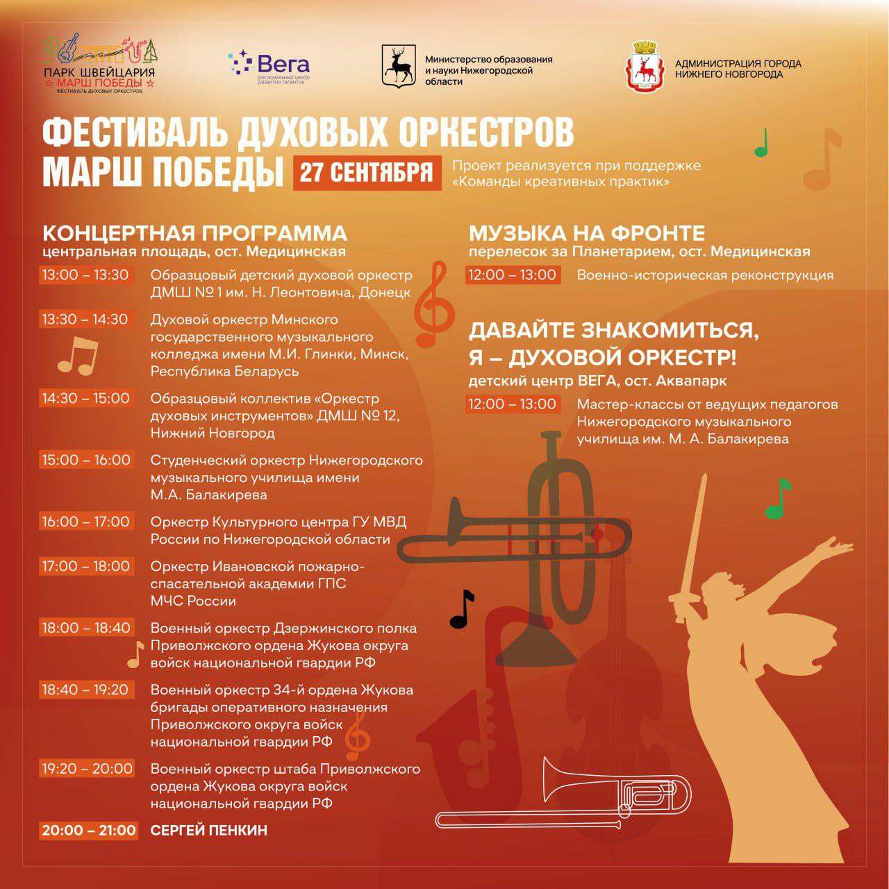 ФЕСТИВАЛЬ ДУХОВЫХ ОРКЕСТРОВ «МАРШ ПОБЕДЫ» 27 сентября в субботу завершит парковый сезон и поставит яркий аккорд в главной теме мероприятий этого года — 80-летие Великой ПОБЕДЫ.