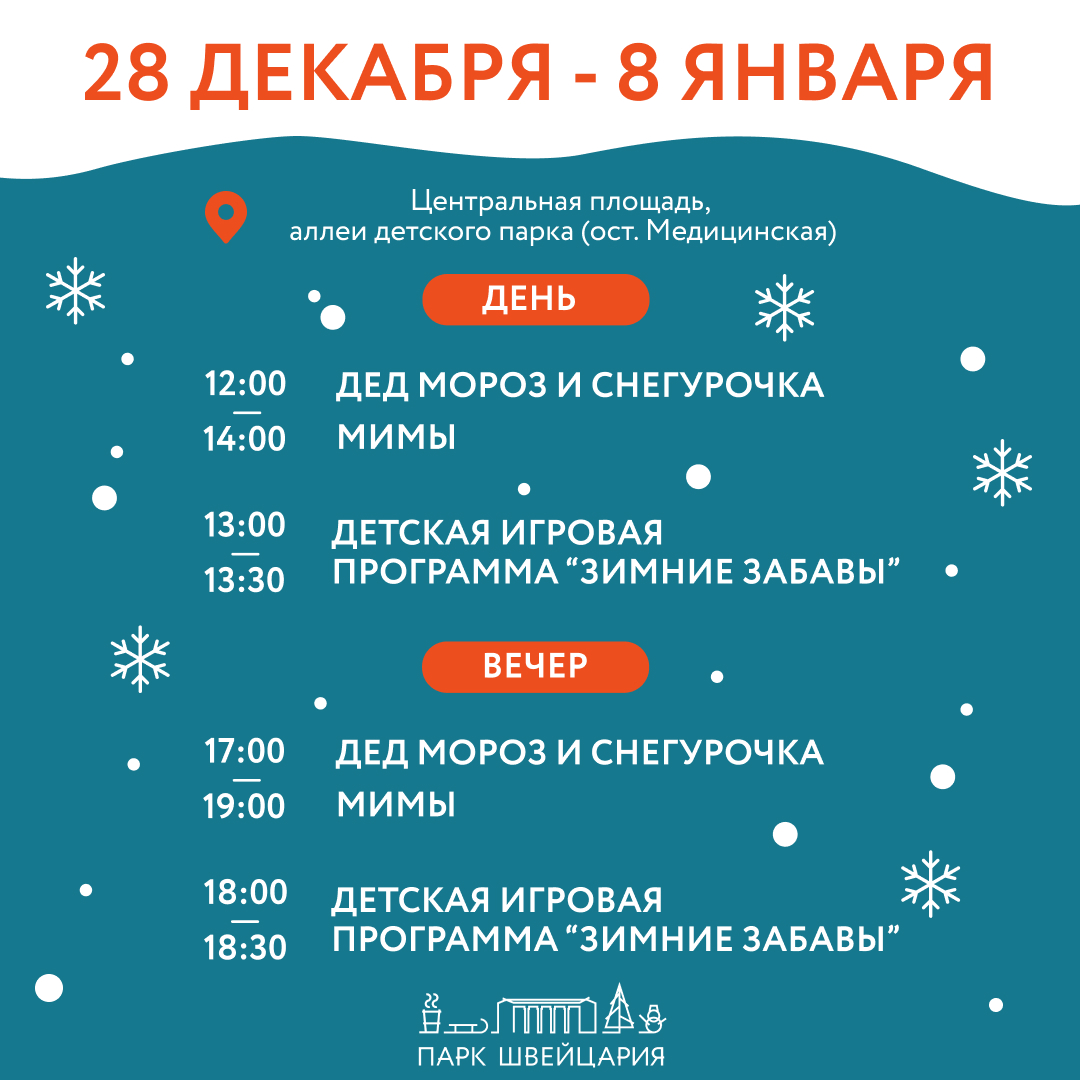 Каждый день по аллеям и дорожкам «Швейцарии» будут прогуливаться Дед Мороз и Снегурочка, забавные персонажи, а сказочные герои согреют малышей и взрослых играми «Зимние забавы».