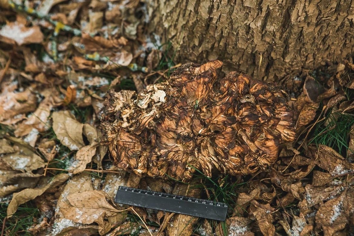 По его словам, гриб располагался на земле недалеко от старого дуба с южной стороны. Само дерево выглядит ослабленным, на корневых лапах его имеются «сухобочины», на стволе – «желваки».