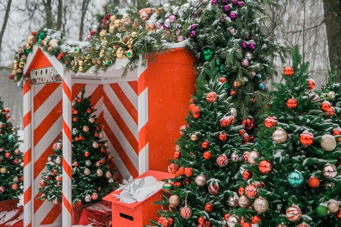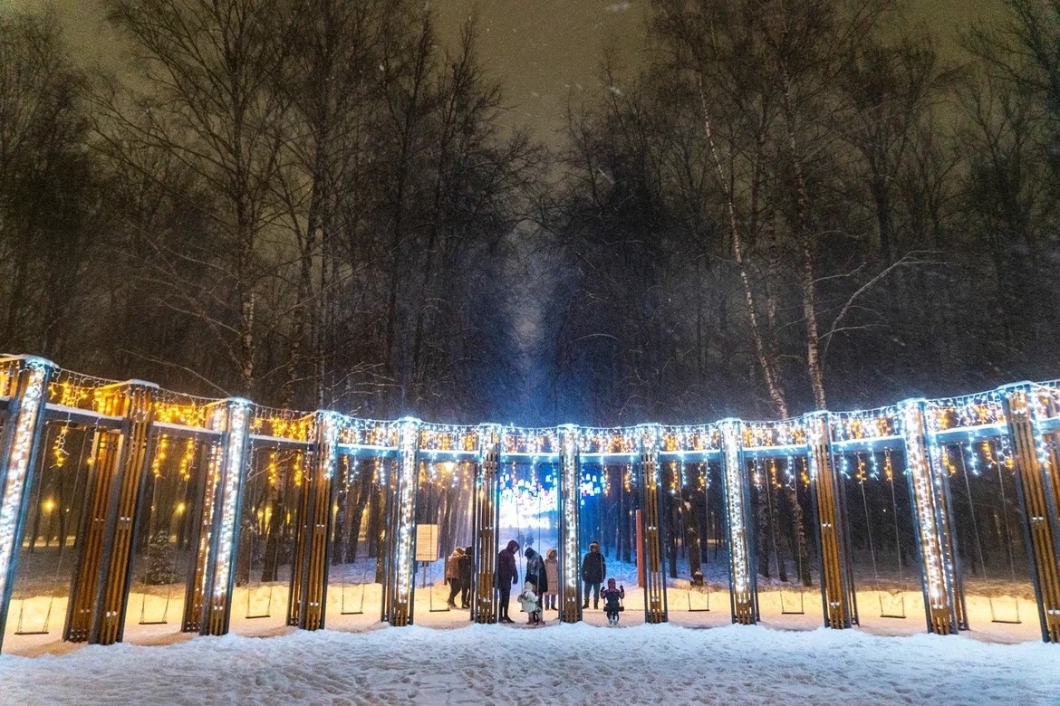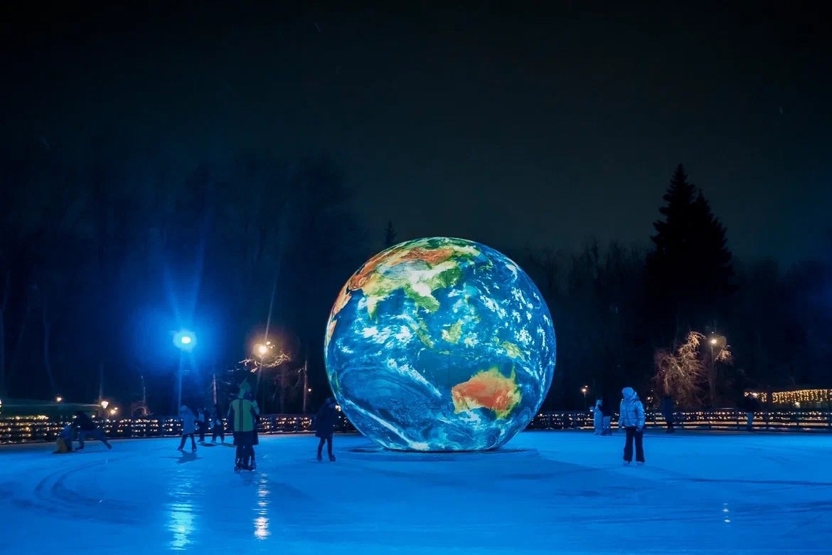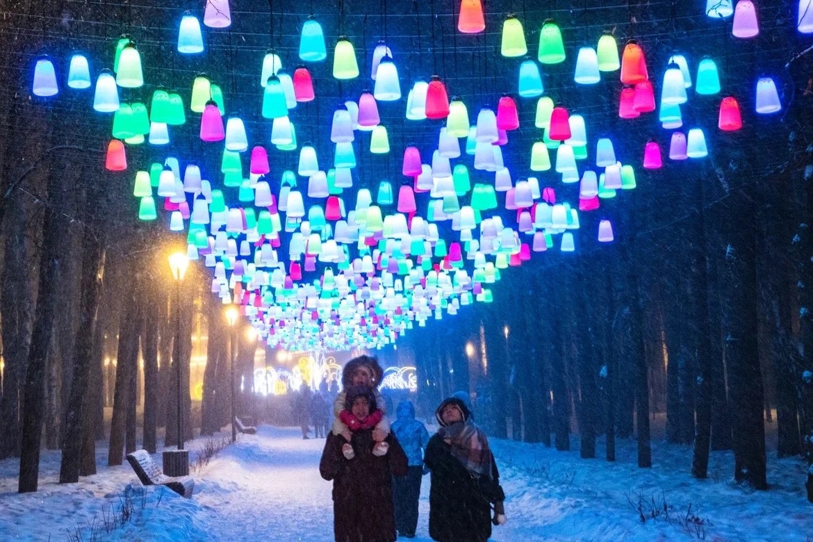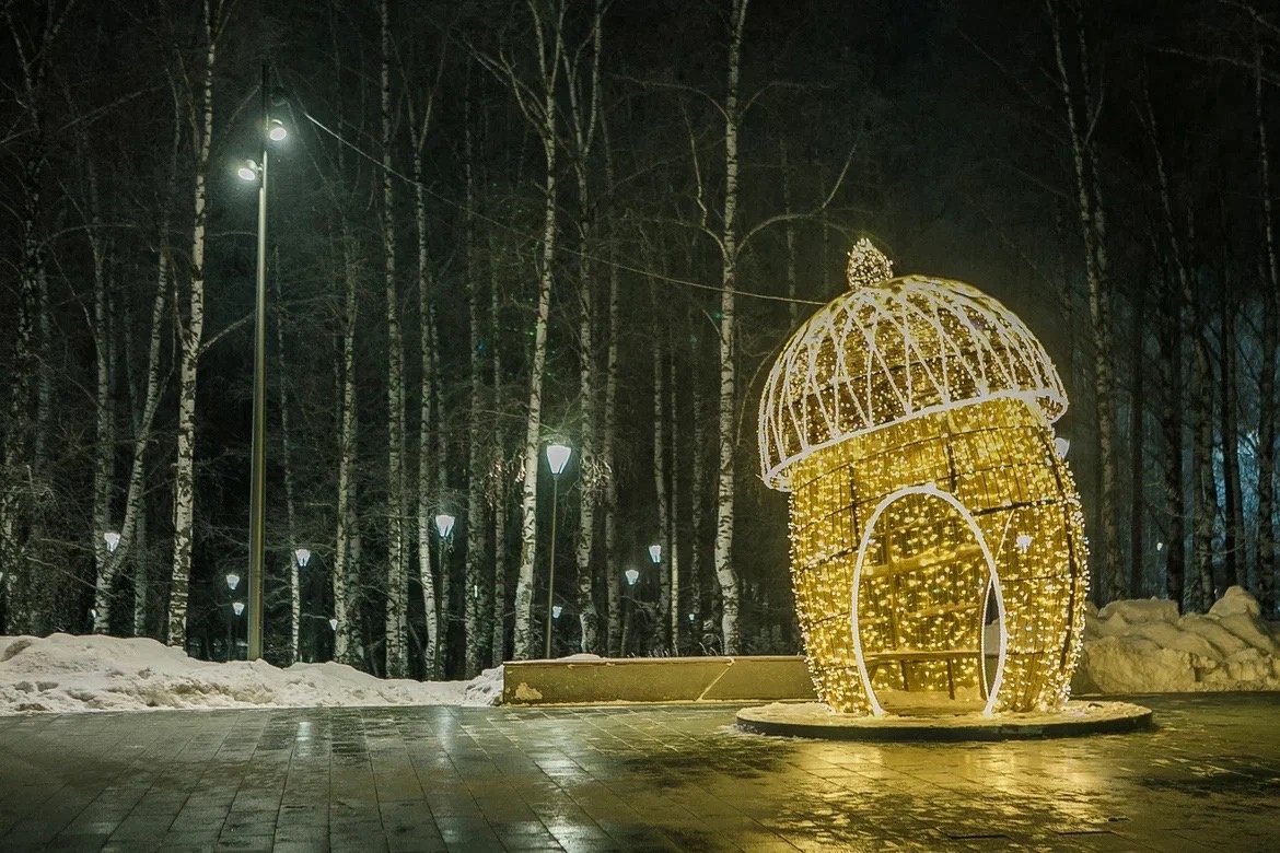 Огромный земной шар на катке. Аллея с разноцветными фонариками. Шустрые и милые белки. Очаровательные птицы. Звезда на входе в парк у остановки «Караваиха». Новогодний экспресс и станция отправления и назначения паровозика. Большие шишка и желудь.