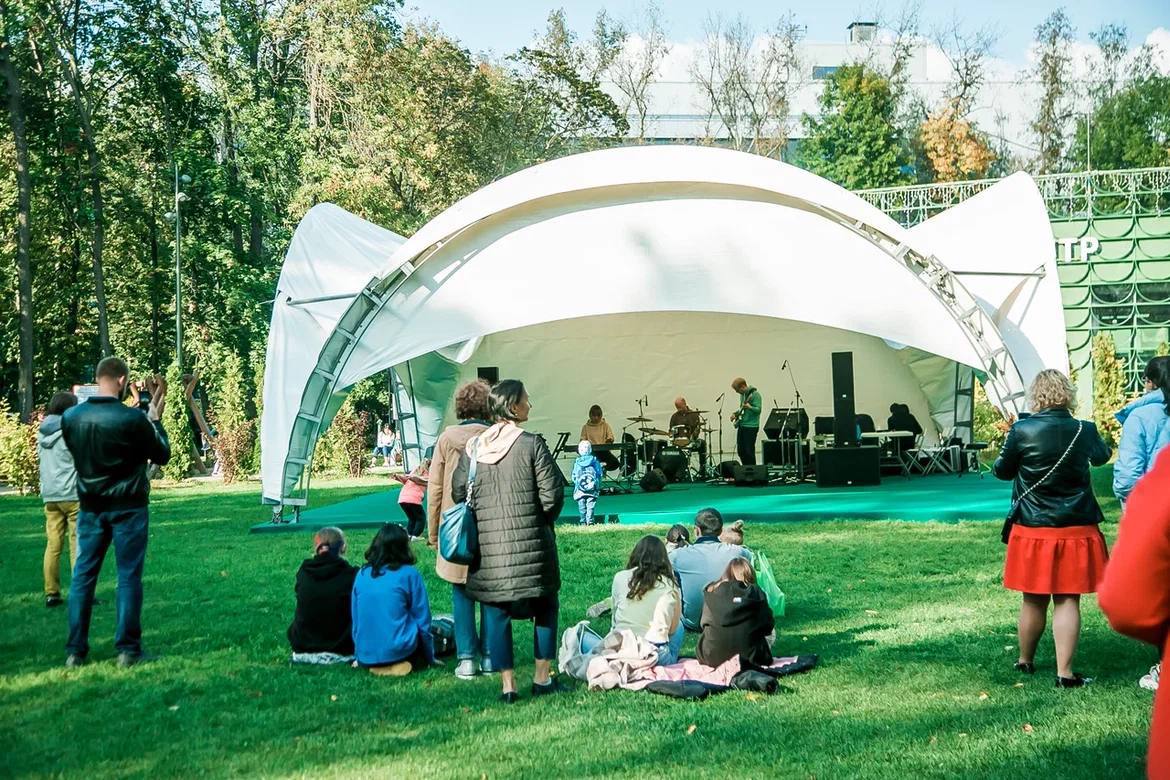 Затем на большой зеленой лужайке около детского центра гости парка попадут в атмосферу городского двора, место душевных встреч, общения нескольких поколений, живущих бок-о-бок. И в этот двор заглянет в гости джаз.