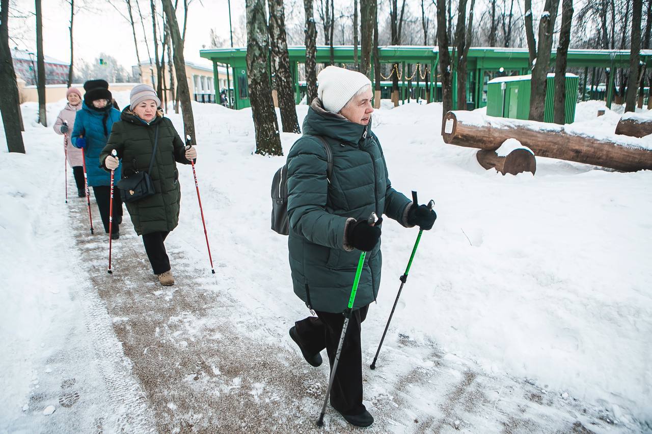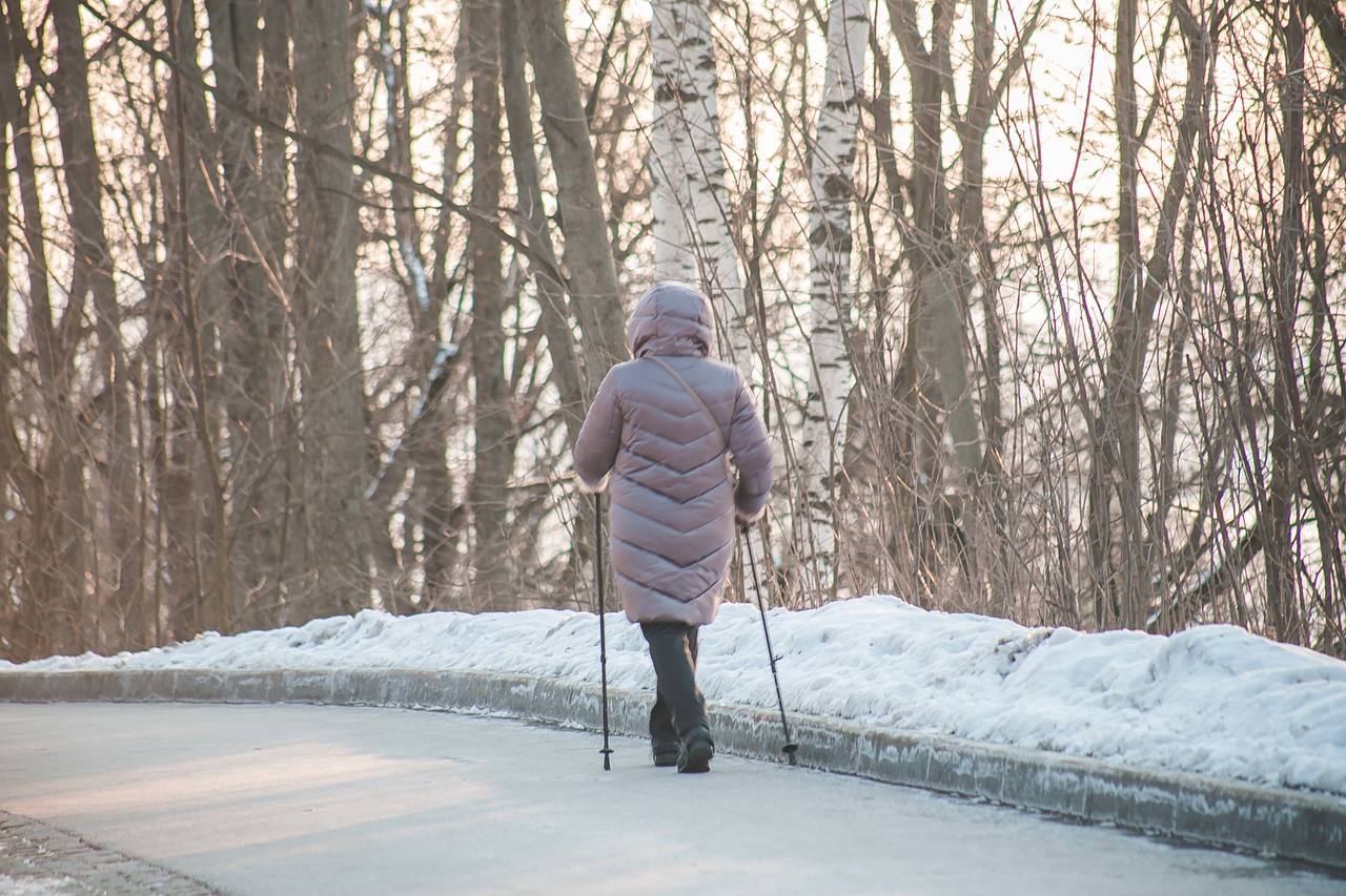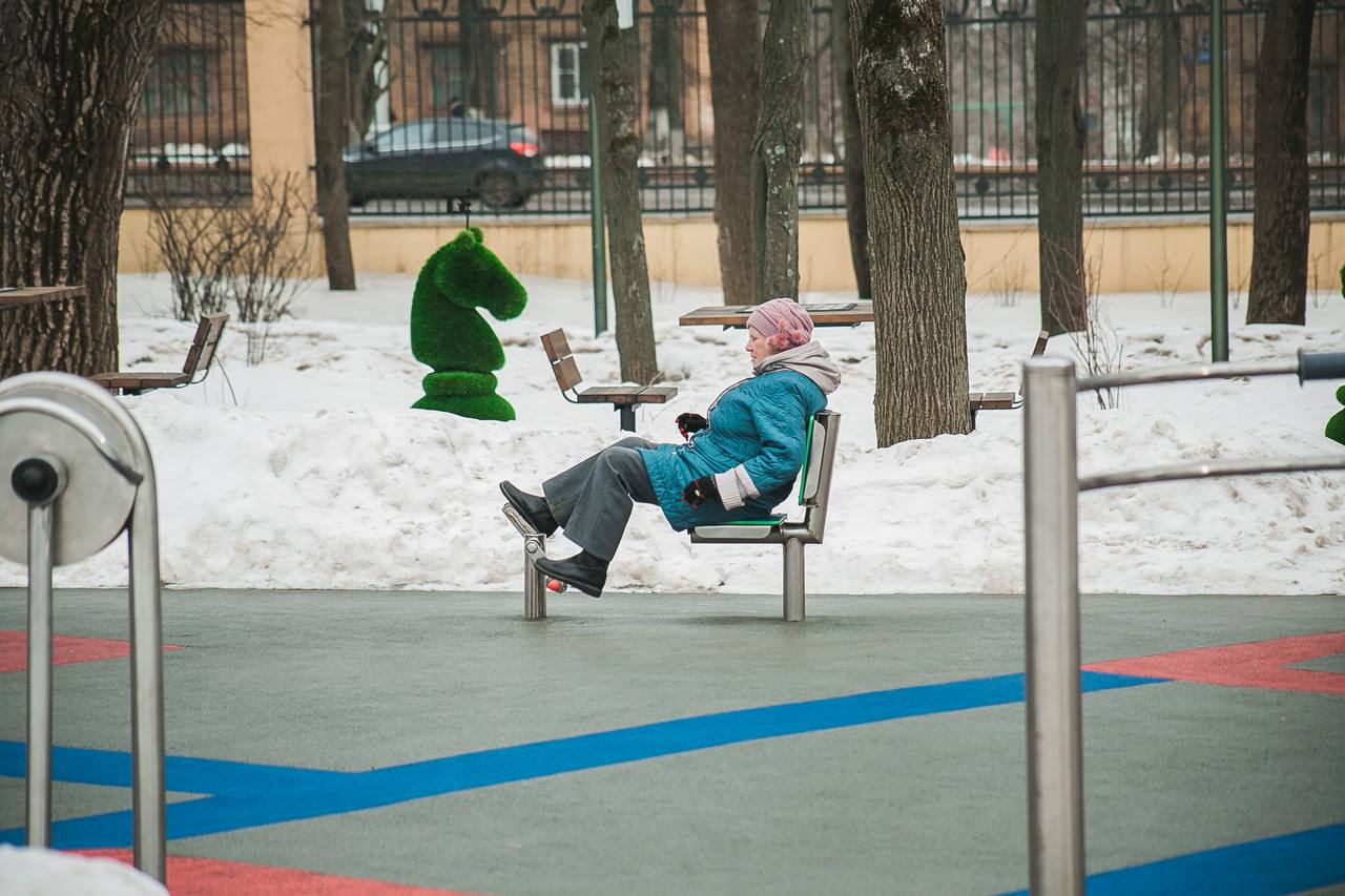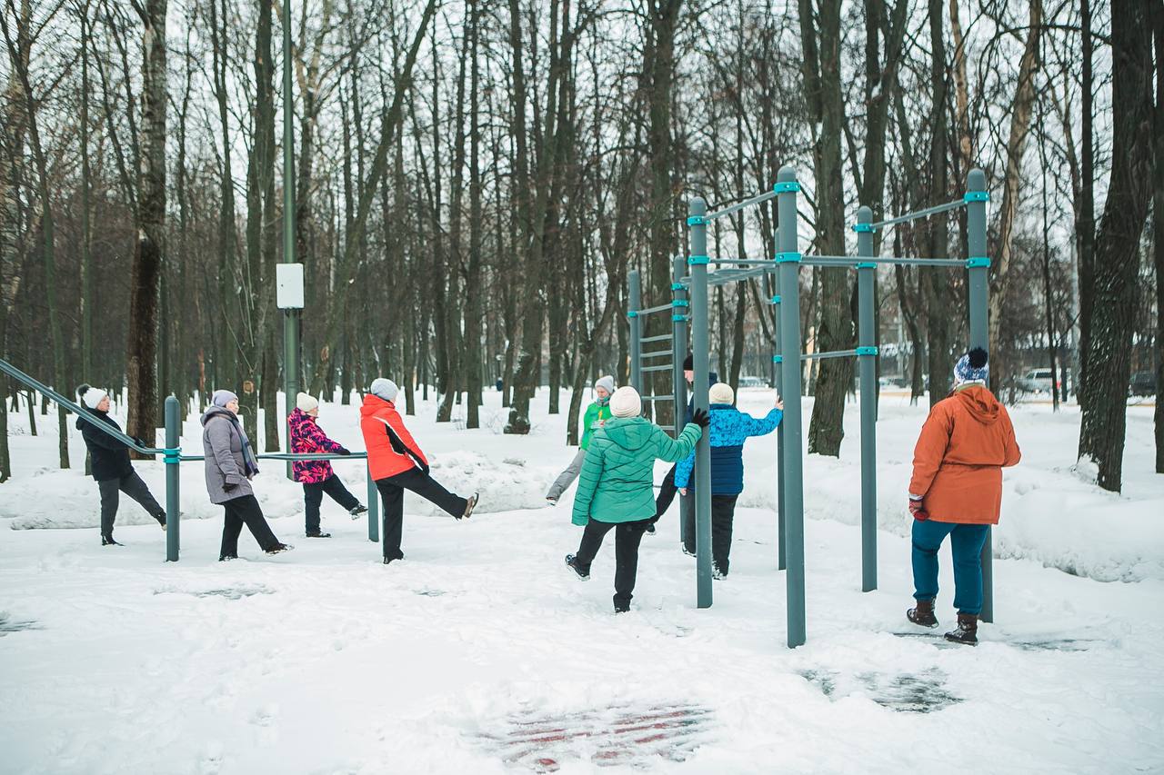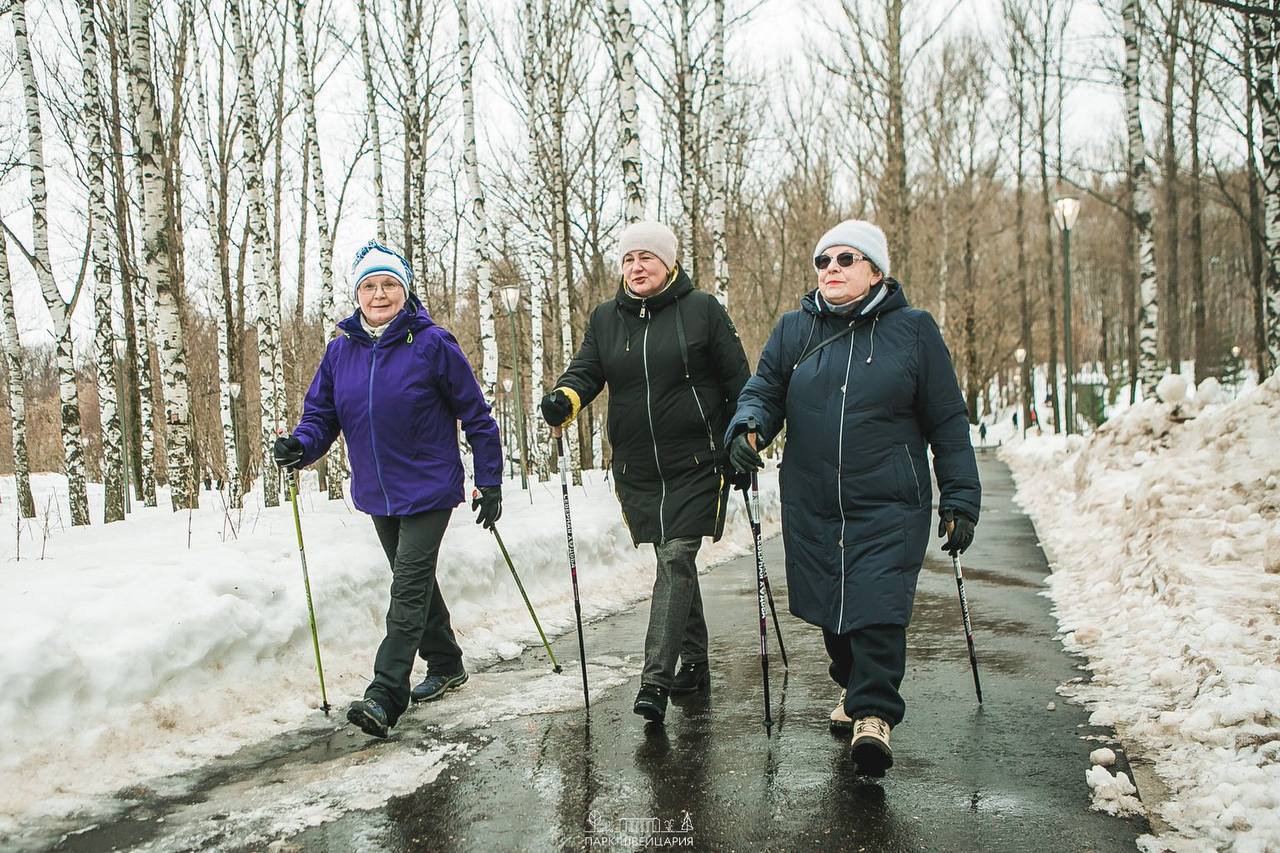 Северная ходьба, активные и пока еще лыжные прогулки по аллеям парка, зарядка на полянах, кросс-фит, тяжелая атлетика и занятия на тренажерах площадки 65+ — беспроигрышный набор для укрепления здоровья.